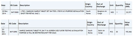Dữ liệu trên trang Zauba cho thấy đã có 2 dòng tablet được nhập khẩu vào Ấn Độ |