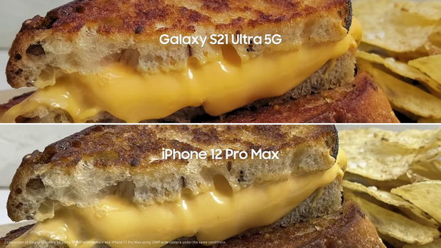 Do chụp ảnh là tính năng nổi bật nhất trên cả hai dòng smartphone này, vậy nên Samsung muốn nhấn mạnh vào khả năng chụp ảnh của Galaxy S21 Ultra. Trong đoạn quảng cáo đầu tiên, Galaxy S21 Ultra và iPhone 12 Pro Max được so sánh về khả năng chụp ảnh đồ ăn. Samsung cho rằng Galaxy S21 Ultra đem lại độ chi tiết cao hơn nhờ vào cảm biến 108MP, so với chỉ 12MP của iPhone 12 Pro Max. Ngoài ra, chúng ta còn có thể thấy rằng smartphone của Samsung cho màu sắc "nịnh mắt" hơn so với iPhone, khiến cho đồ ăn cũng vì thế mà trở nên hấp dẫn hơn.