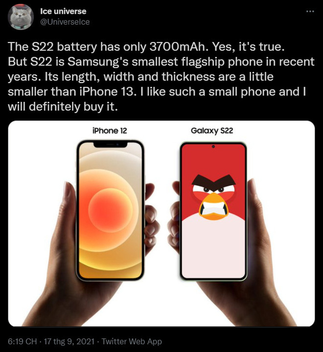 Tuy nhiên đây sẽ là một động thái gây tò mò cho giới công nghệ vì Samsung vốn đã quá phổ biến với các dòng smartphone màn hình lớn, ví dụ như dòng Galaxy Note. Tuy nhiên, đây có thể là một động thái tốt đối với những người thích những chiếc máy nhỏ nhắn, dễ cầm. Bởi theo Ice Universe thân máy của Galaxy S22 phiên bản "mini" sẽ nhỏ hơn cả iPhone 13 mới.
