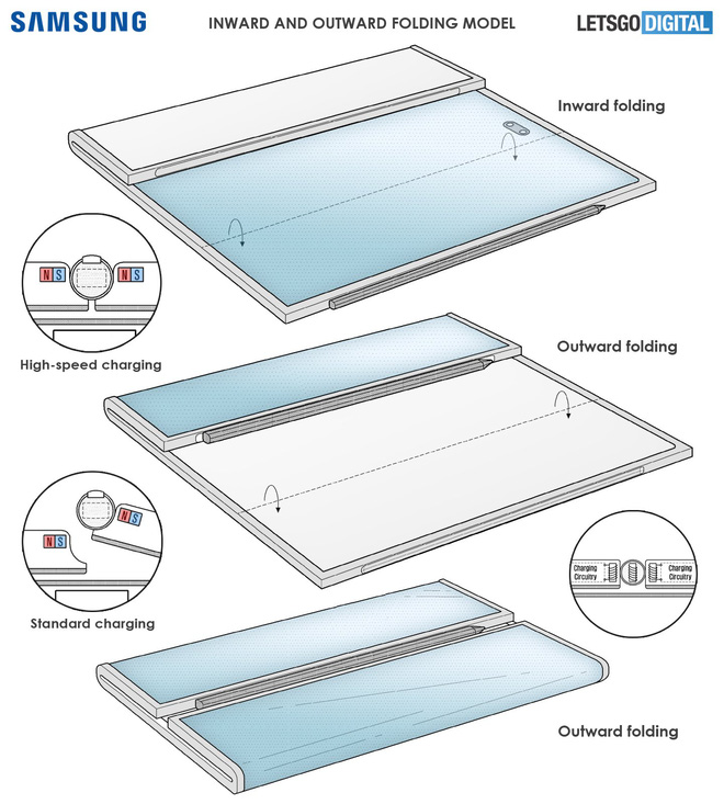 Samsung cũng đã đăng ký bằng sáng chế cho thiết bị máy tính bảng màn hình gập. Theo các bằng sáng chế này thì sẽ có 2 thiết kế của Galaxy Z Fold Tab. Một kiểu thiết kế đơn giản với một bản lề gập, giống như một cuốn sách và không có màn hình ngoài.