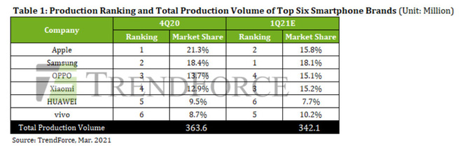 Apple đã vượt mặt Samsung trong Q4/2020 để trở thành nhà sản xuất smartphone số 1 trên thế giới nhưng theo nghiên cứu mới đây, vị trí của Apple không duy trì được quá lâu.