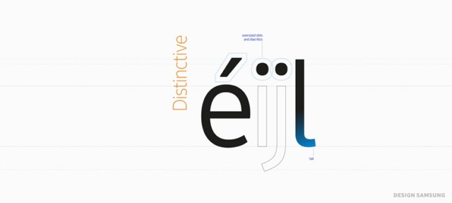 - Dễ phân biệt: Các chữ cái với những góc đặc trưng có được từ việc giao nhau giữa một đường cong với một đường thẳng, đã tạo ra một cá tính thiết kế nhất quán. Các chấm nổi bật, các dấu phụ dễ phân biệt và phần đuôi của chữ I làm tăng thêm sự dễ đọc như việc chúng tôi cung cấp một số nét dễ phân biệt cho thiết kế của Samsung One.