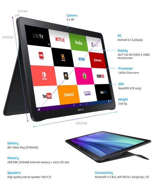 Sau khi trưng bày tại triển lãm IFA 2015 vừa qua, Samsung hôm nay chính thức trình làng mẫu Galaxy Tab View với màn hình siêu lớn, tới 18,4 inch. Máy sử dụng công nghệ màn TFT LCD với độ phân giải Full HD cho mật độ điểm ảnh là 123 ppi.