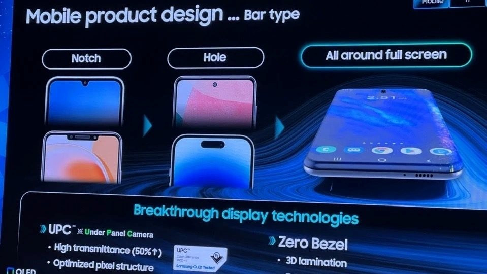 Theo The Elec, Giám đốc Samsung Display Jung Yong-wook đã phát biểu tại Diễn đàn Kinh doanh K-Display ở Seoul tuần trước. Trong đó, ông nói hãng đang nghiên cứu và phát triển một loại màn hình hoàn toàn không viền, loại bỏ giới hạn giữa màn hình và khung, kết hợp với hệ thống camera ẩn dưới màn hình thế hệ mới. Trước đó, Apple đã đặt hàng Samsung và LG phát triển tấm nền OLED không viền để trang bị trên những mẫu iPhone trong tương lai.