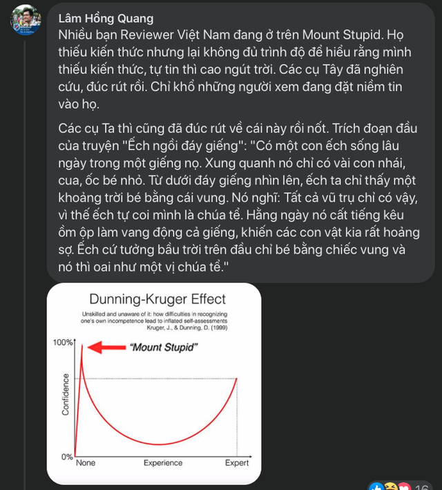"Nhiều bạn Reviewer Việt Nam đang ở trên Mount Stupid. Họ thiếu kiến thức nhưng lại không đủ trình độ để hiểu rằng mình thiếu kiến thức, tự tin thì cao ngút trời. Các cụ Tây đã nghiên cứu, đúc rút rồi. Chỉ khổ những người xem đang đặt niềm tin vào họ", ông Quang bình luận về các reviewer ở Việt Nam.