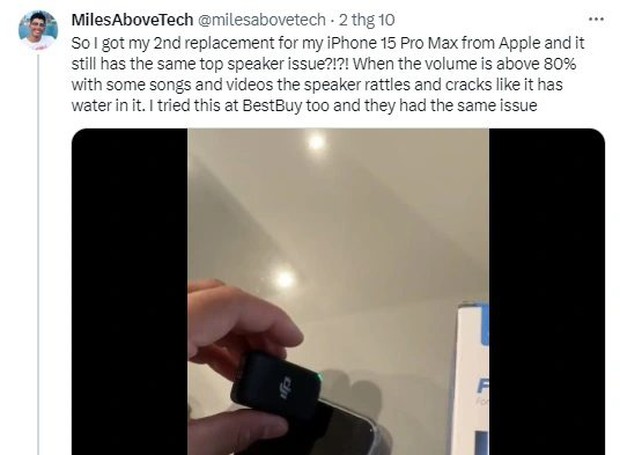 Một người dùng tài khoản X/Twitter "MilesAboveTech" cho biết mình có thể sẽ phải đổi iPhone 15 Pro Max (tại trung tâm bảo hành của Apple) tới lần thứ 3 vì lỗi loa. Theo đó, cả 2 chiếc điện thoại mới mua và được Apple đổi trả đều phát ra âm thanh "như có nước bên trong" khi phát video và nhạc "ở âm lượng 80%".