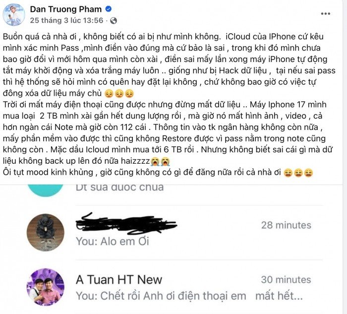 Theo chia sẻ, chiếc iPhone 17 dung lượng 2TB của nam ca sĩ đã mất hoàn toàn dữ liệu lưu trữ lâu nay. Hàng nghìn ghi chú, thông tin quan trọng và cả dữ liệu liên quan đến đăng nhập ngân hàng đều biến mất. Điều đáng nói, dù đã đăng ký gói iCloud 6TB, dữ liệu lại không được đồng bộ mà chỉ lưu trực tiếp trên thiết bị, khiến việc khôi phục gần như không thể.