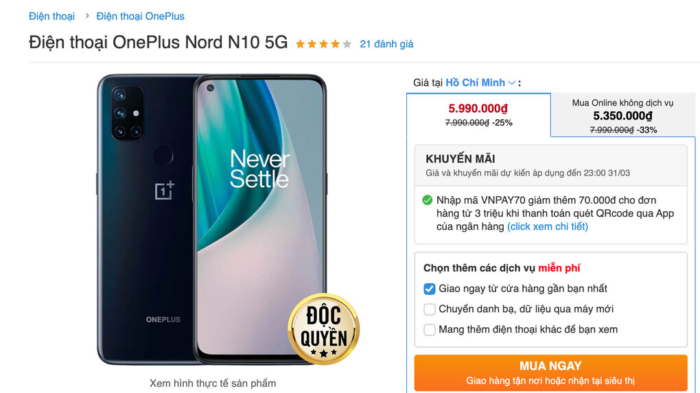 Một hệ thống di động lớn vừa điều chỉnh giá bán Nord N10 của thương hiệu OnePlus về mức 5,9 triệu đồng, giảm 2 triệu đồng so với thời điểm mới ra mắt. Đây là smartphone 5G đầu tiên Việt Nam có giá dưới 6 triệu đồng.