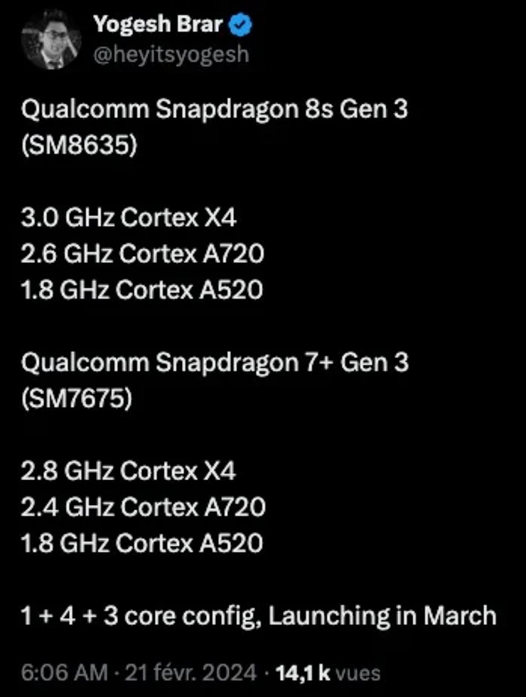 Thông tin về Snapdragon 8s Gen 3 được đưa ra bởi chuyên gia rò rỉ Digital Chat Station trên mạng xã hội Weibo của Trung Quốc liên quan đến một mẫu smartphone bí ẩn sử dụng chip này. Chip có tên mã SM8635 được tuyên bố đi kèm lõi chính Cortex-X4 tốc độ 3,01 GHz, 4 lõi hiệu suất Cortex-A720 tốc độ 2,61 GHz và 3 lõi tiết kiệm năng lượng Cortex-A520 tốc độ 1,84 GHz. Chip này cũng đi kèm GPU Adreno 735.