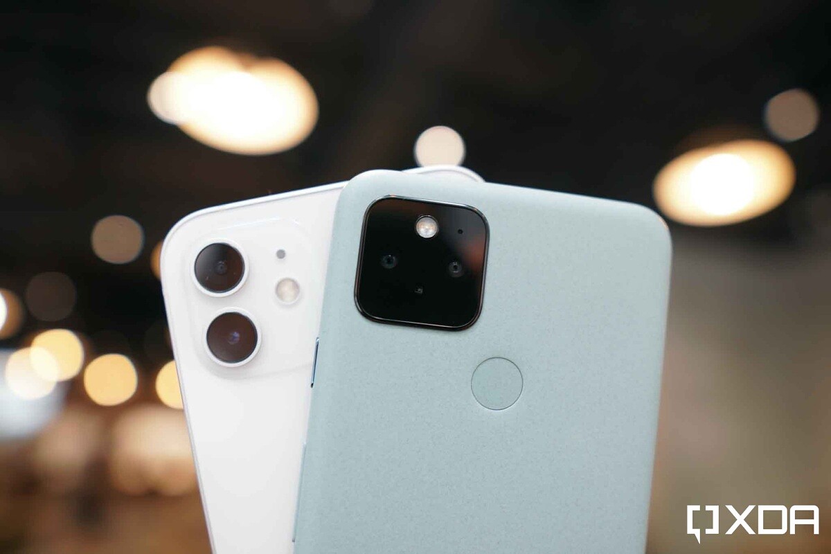 Cả hai đều trang bị hệ thống camera ống kính kép, khung camera hình vuông mà ở Việt Nam hay gọi vui là "bếp từ" ở góc trên bên trái. Đều có độ phân giải ở ống kính chính là 12MP, nhưng iPhone 12 mở rộng khẩu độ lên F1.6 còn Pixel 5 là F1.7. Ống góc siêu rộng trên iPhone 12 là 12MP với khẩu F2.4, còn Pixel 5 là 16MP với khẩu F2.2, trường nhìn iPhone rộng hơn một chút - 110 độ so với 107 độ của Pixel 5.