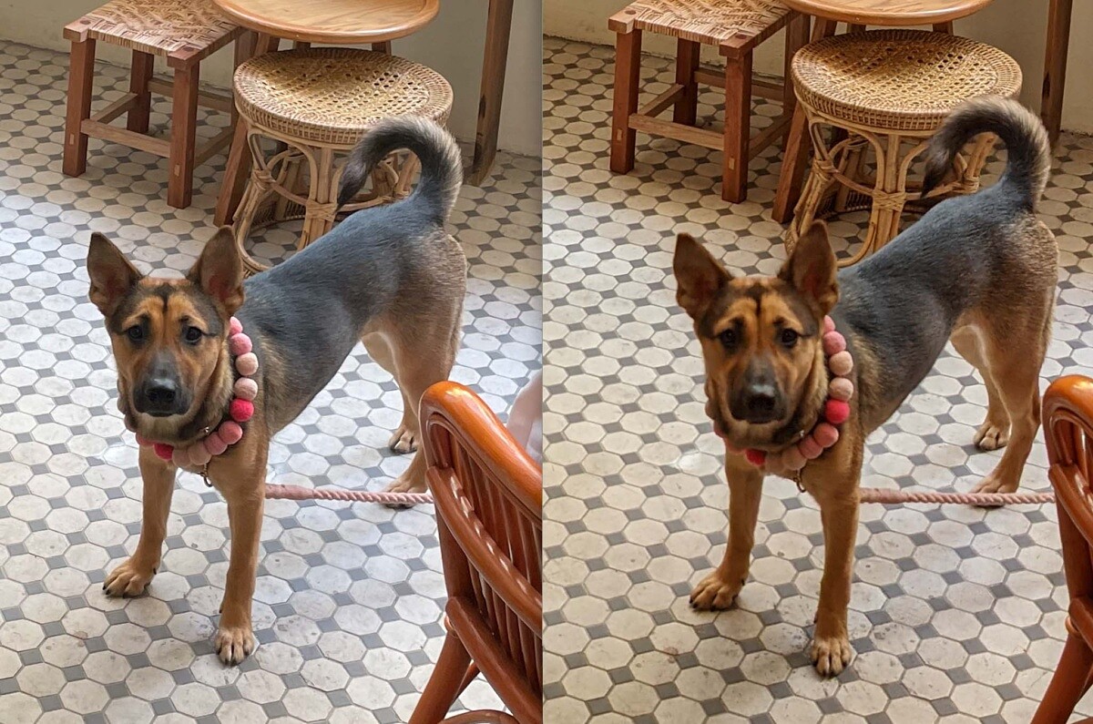 Theo cảm nhận cá nhân tôi, iPhone 12 có ánh sáng nhiều hơn một chút so với Pixel 5. Khi tôi zoom lại kỹ hơn, máy cho ảnh nét hơn và ít nhiễu hơn Pixel 5. Tôi thử chụp một con chó, iPhone 12 giữ được nhiều chi tiết hơn so với Pixel 5, đặc biệt là ở khuôn mặt chú chó.