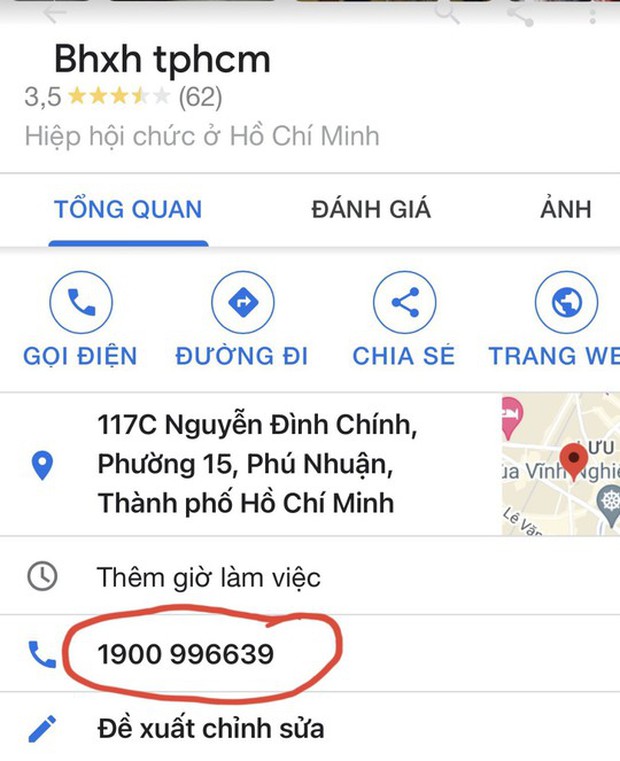 Tại TP HCM, cơ quan BHXH cũng đã tiến hành rà soát và phát hiện trên trang Google Map (https://www.google.com/maps) khi tìm kiếm BHXH TP HCM và BHXH của các quận, huyện thì phần liên hệ đã bị sửa thông tin tổng đài liên hệ thành số 1900.9966.xx.