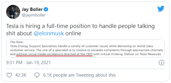 Vì vậy, thật lạ là mới đây, Tesla lại bắt đầu tuyển một "chuyên viên hỗ trợ khách hàng" toàn thời gian. Công việc của nhân viên này sẽ "giải quyết các căng thẳng leo thang trên mạng xã hội nhắm tới CEO" – hay nói cách khác, người này sẽ có nhiệm vụ bảo vệ ông Musk trên mạng xã hội trước những khách hàng giận dữ.