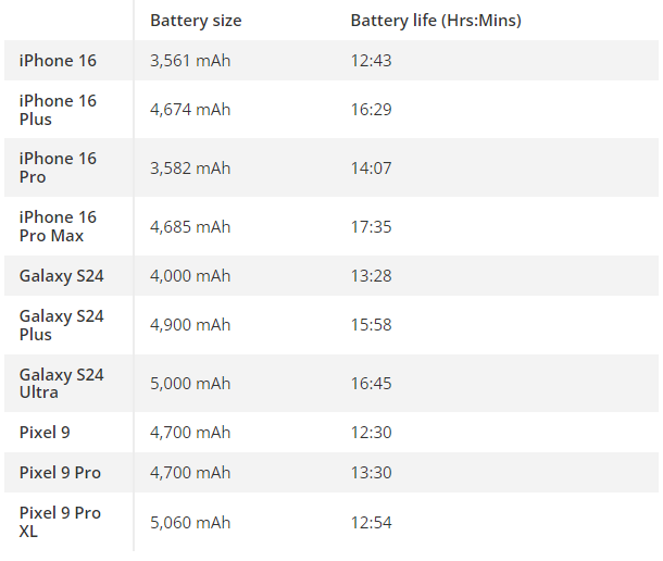 So sánh giữa các thiết bị tương ứng của Apple và Samsung, thời lượng pin là không chênh lệch quá nhiều, dao động trong khoảng 1h. Tất cả đều cho thời lượng pin đủ dùng cả ngày. Các mẫu thuộc iPhone 16 dù có viên pin dung lượng thấp hơn đối thủ S24 nhưng cho kết quả tương đương nhờ con chip và sự tối ưu tốt của Apple. Đặc biệt iPhone 16 Pro Max có thời lượng pin tốt hơn so với Galaxy S24 Ultra.