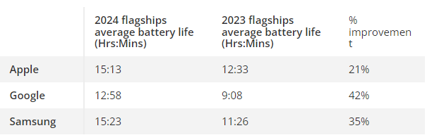 Dòng Galaxy S24 gây bất ngờ khi mức độ cải thiện thêm đến 35%, nhờ vào thực tế là cả ba mẫu mới đều kéo dài ít nhất 3 giờ so với các mẫu Galaxy S23 tương đương. Cuối cùng, iPhone 16 đạt mức tăng 21% so với kết quả của dòng iPhone 15.