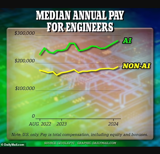 Theo dữ liệu từ nền tảng dịch vụ nghề nghiệp Levels.fyi, mức thu nhập trung bình hàng năm cho các kỹ sư AI là khoảng 280.000 USD (tương đương 6,9 tỷ đồng) trong khi các kỹ sư không chuyên AI sẽ chỉ kỳ vọng hưởng mức lương gần 190.000 USD (khoảng 4,7 tỷ đồng).
