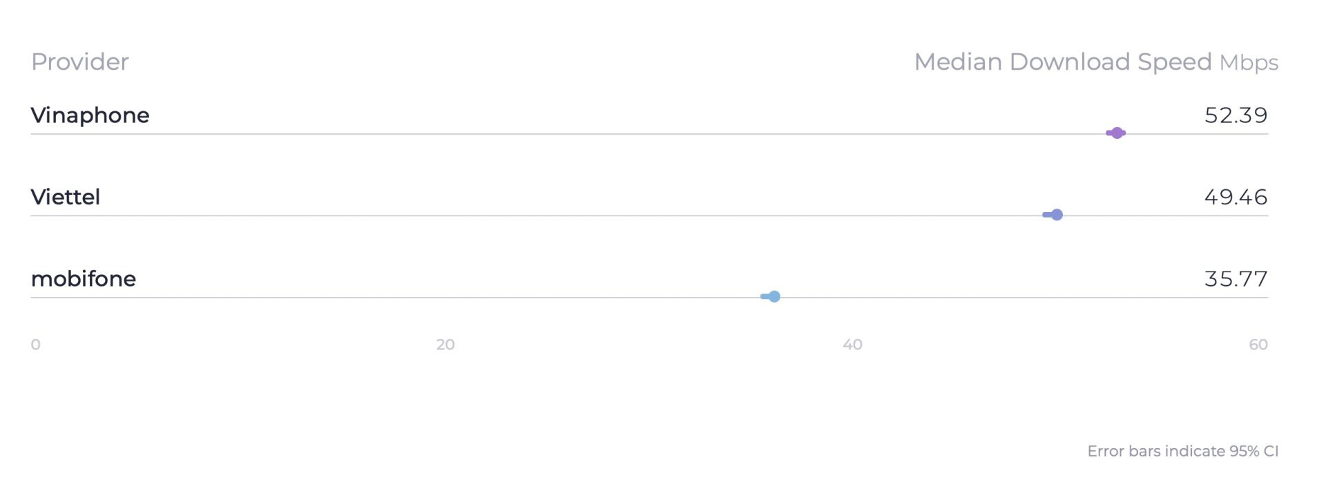 Bên cạnh đó, số liệu của Speedtest còn cho thấy trong số các nhà mạng tại Việt Nam, VinaPhone có tốc độ tải xuống trung bình nhanh nhất, 52,39 Mb/giây trong quý II năm nay. Viettel và MobiFone đứng sau với tốc độ lần lượt 49,46 Mb/giây và 35,77 Mb/giây.