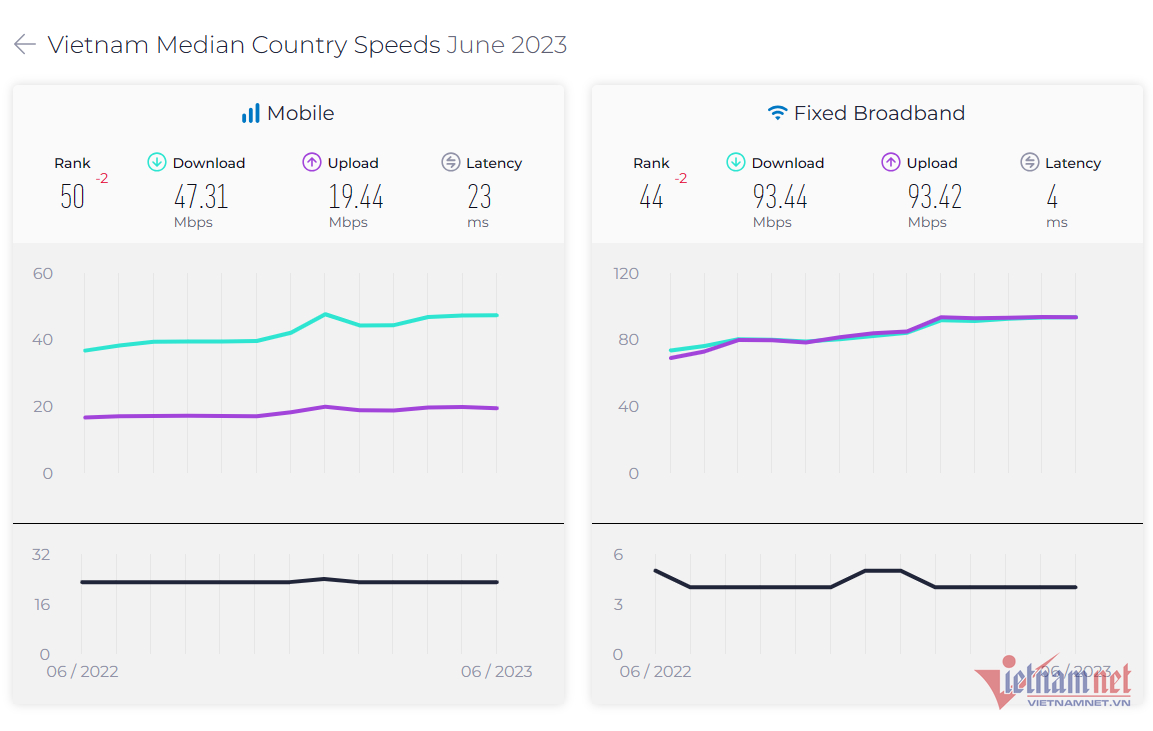 Ookla vừa công bố bảng xếp hạng Speedtest Global Index tháng 6. Theo đó, tốc độ Internet băng rộng di động và cố định của Việt Nam lần lượt xếp hạng 50 và 44 thế giới. Cụ thể, khi dùng băng rộng di động, tốc độ tải xuống trung bình là 47,31 Mb/giây, tải lên là 19,44 Mb/giây, độ trễ 23ms. Với băng rộng cố định, tốc độ tải xuống trung bình là 9,344 Mb/giây, tải lên là 93,42 Mb/giây, độ trễ 4ms.