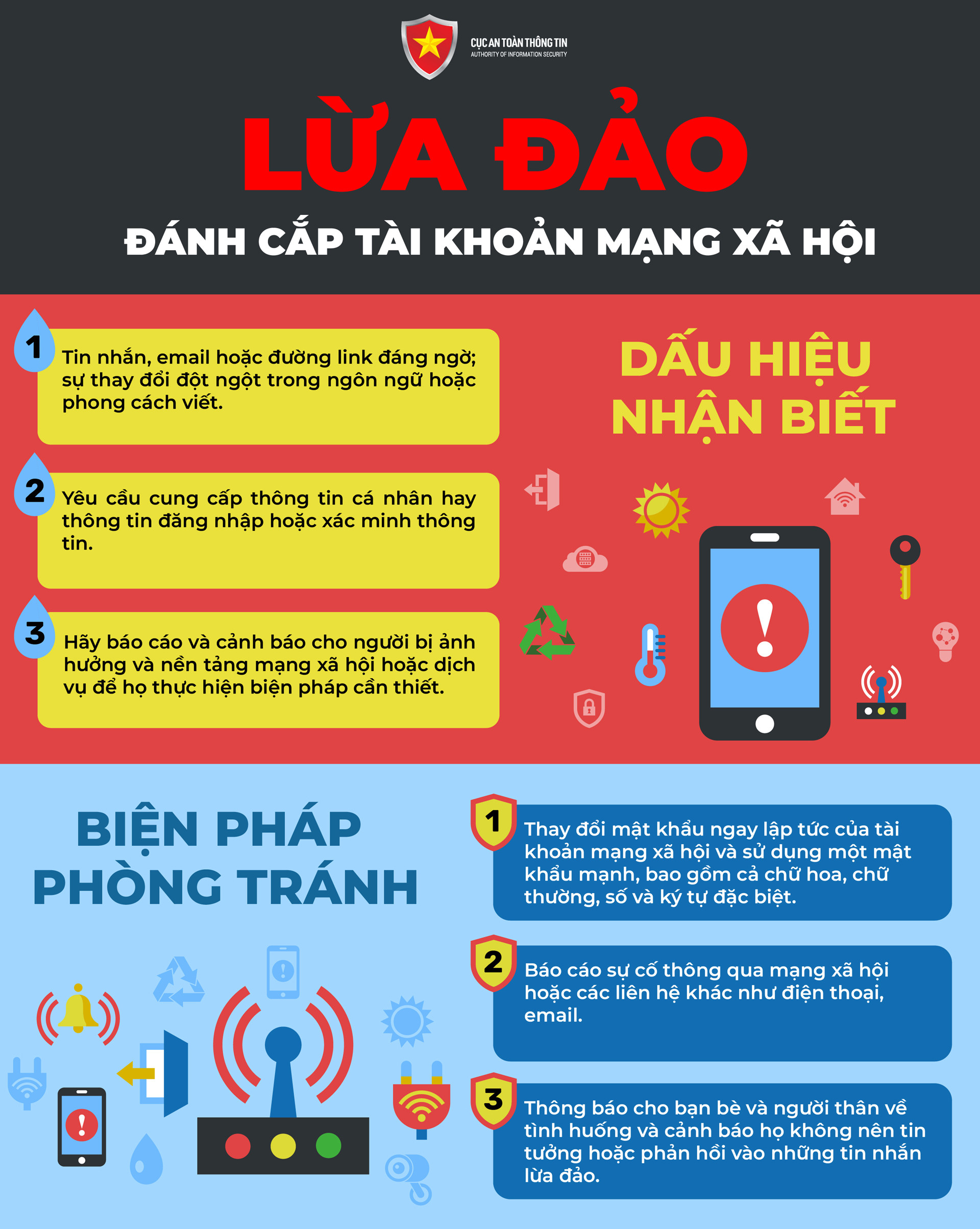 Trường hợp phát hiện tài khoản mạng xã hội có dấu hiệu bất thường, người dùng cần thay đổi mật khẩu và đặt mật khẩu mạnh; Báo cáo sự cố qua mạng hoặc các liên hệ khác như điện thoại, email. Đồng thời, thông báo cho bạn bè, người thân trong danh sách bạn bè trên mạng về tình huống và cảnh báo họ không nên tin tưởng hoặc phản hồi những tin nhắn nghi ngờ lừa đảo.