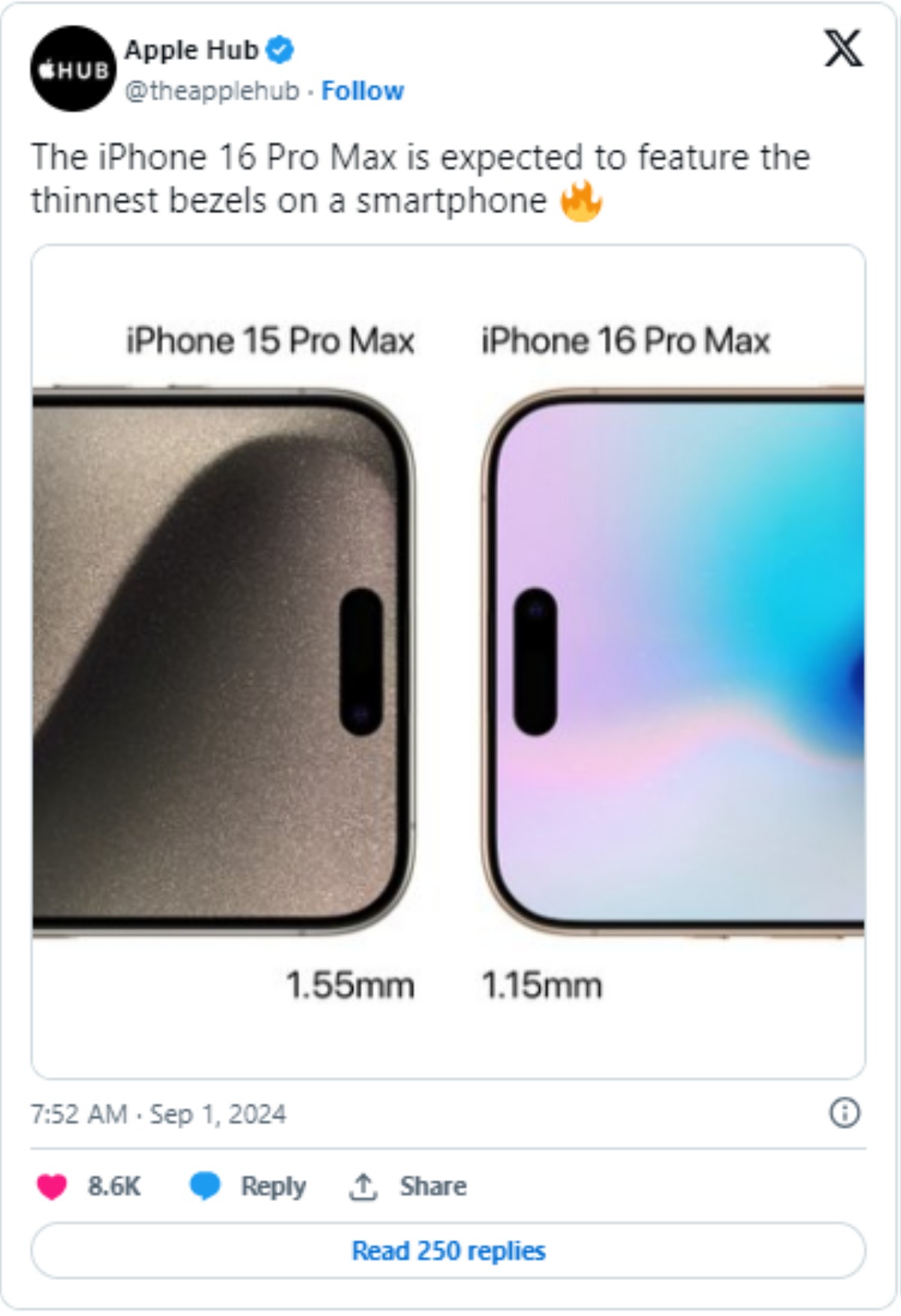 Theo các thông tin rò rỉ gần đây, iPhone 16 Pro Max có thể sẽ có màn hình lớn hơn nhờ viền màn hình được thu nhỏ từ 1,5mm xuống 1,15mm. Điều đó giúp màn hình của phiên bản Pro Max tăng từ 6,69 inch lên 6,86 inch mà không làm tăng kích thước tổng thể. Trong khi đó, iPhone 16 Pro dự kiến sẽ có màn hình lớn hơn, từ 6,12 inch lên 6,27 inch.