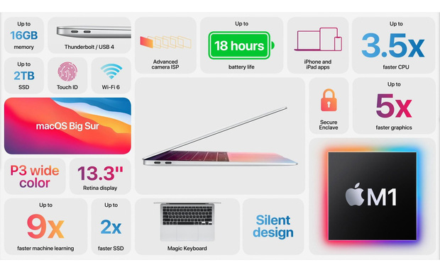 Apple Silicon trong MacBook Air mới là một nâng cấp lớn, mang lại hiệu suất, tuổi thọ pin và hiệu quả được cải thiện tốt hơn. Con chip Apple M1 và thời lượng pin lên tới 18 giờ là tất cả những gì Apple đã nhắc đến khi giới thiệu sản phẩm này.