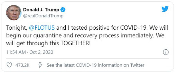 Vào ngày hôm nay trên tài khoản Twitter cá nhân của mình Tổng thống Donald Trump đã thông báo về việc ông và vợ mình dương tính với virus Covid-19.
