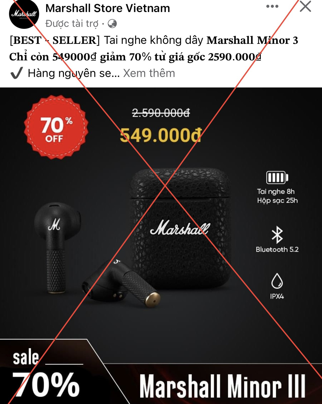 Trong 2 tuần gần đây trên Facebook liên tục xuất hiện các quảng cáo được tài trợ về chiếc tai nghe Marshall Minor 3 giả mạo giá chỉ 549.000 đồng, giảm 70% từ giá gốc 2.590.000 đồng.