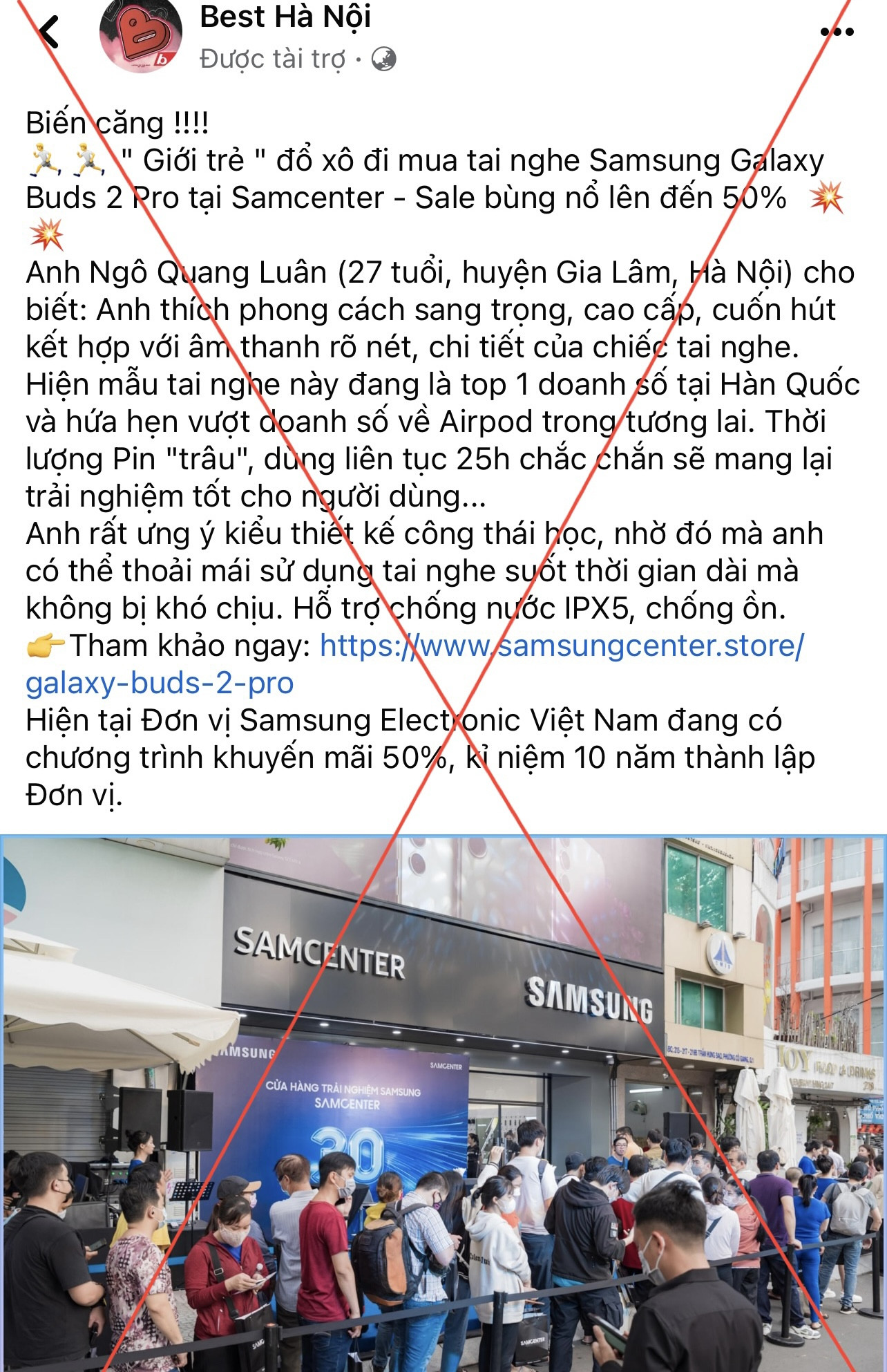 Các trang này đều quảng cáo với nội dung “Hiện Samsung Electronic Việt Nam đang có chương trình khuyến mãi 50% nhân kỉ niệm 10 năm thành lập”, đi kèm đó là các hình ảnh ra mắt sản phẩm trước đây. Đáng chú ý, ở các facebook cá nhân còn quảng cáo một cách lộ liễu hơn khi “tình cờ vào website của hãng xem lại thì thấy giảm giá tới 70% còn miễn phí ship, tai nghe gần 4 triệu giảm giá còn 599K, mua combo 2 chiếc giảm 75% (tính ra còn hơn 500k/chiếc”…