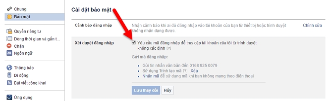 Bật tính năng xác minh 2 bước trên Facebook bằng cách vào phần thiết lập tài khoản (Cài đặt) -> Bảo mật -> Xét duyệt đăng nhập (như hình trên), sau đó làm theo hướng dẫn.