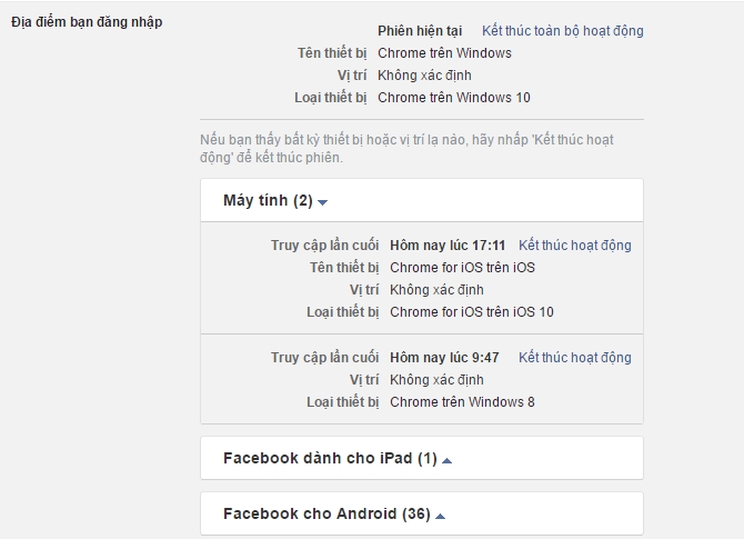 Cũng trong phần thiết lập bảo mật, tại mục Địa điểm bạn đã đăng nhập (Where You're Logged In), bạn có thể quản lý tất cả các thiết bị (trình duyệt, ứng dụng) đã đăng nhập vào tài khoản của mình, nếu có bất cứ thiết bị lạ nào, bạn có thể nhấn Kết thúc hoạt động (End Activity) để đăng xuất tài khoản của mình ra khỏi thiết bị (trình duyệt, ứng dụng) đó. Bạn cũng có thể chọn Kết thúc toàn bộ hoạt động (End All Activity) để đăng xuất tất cả.