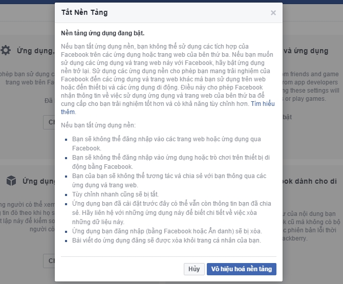 - Ứng dụng, trang web và plugin: Nếu bạn tắt mục này, Facebook sẽ không thể kết nối với các ứng dụng, website hoặc plug-in từ bên thứ ba được nữa.