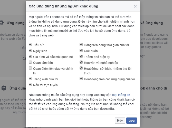 - Ứng dụng người khác dùng: Khi kết nối một app với tài khoản Facebook của bạn, thỉnh thoảng nó sẽ thu thập các thông tin về bạn bè của bạn, và khi bạn bè của bạn cũng dùng app và có kết nối với Facebook thì chúng cũng có thể lấy thông tin từ bạn. Bạn có thể nhấp vào nút Chỉnh sửa để thiết lập thêm nhiều thứ về nó.