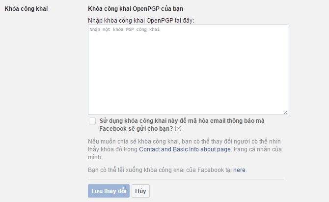 Đây không phải là thiết lập mà phần lớn mọi người sử dụng, nhưng nếu muốn Facebook mã hóa các email thông báo gửi đến email, hãy nhập mã công khai OpenPGP của bạn tại đây.