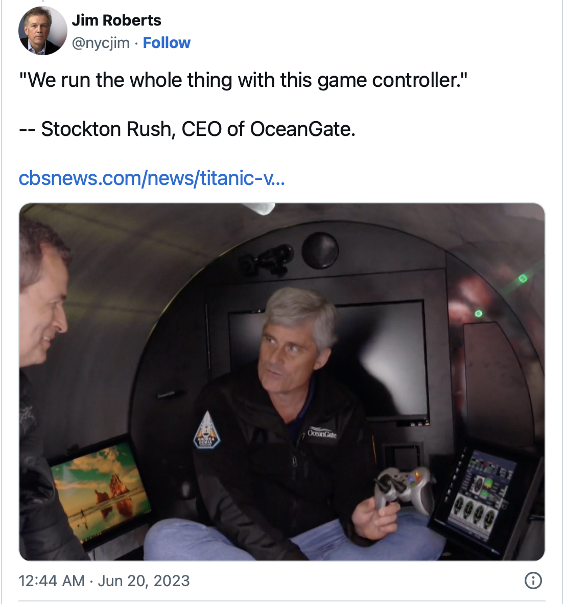 Cộng đồng mạng nhắm vào chi tiết này để chỉ trích công ty như một ví dụ về sự mất an toàn của Titan. Nhiều người lập luận rằng, một chiếc tàu ngầm có khả năng lặn sâu hơn 2 dặm dưới nước và chịu áp suất cao gấp 380 lần so với mực nước biển cần có một hệ thống điều khiển phức tạp hơn. Hơn nữa, một chuyến thám hiểm xác tàu Titanic cần có nhiều chuông, còi, đèn nhấp nháy hơn chứ không phải chỉ mỗi màn hình PC và tay cầm máy chơi game.