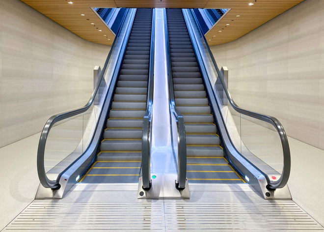 Tuy nhiên đây không phải phần chính. Sau khi đi hết con đường này, sẽ thấy chiếc thang cuốn đưa chúng ta lên tầng 2. Và đây chính là không gian mái vòm độc đáo bên trong quả cầu. Trong ngày khai trương, rất nhiều du khách đã đến đây để chụp ảnh checkin.
