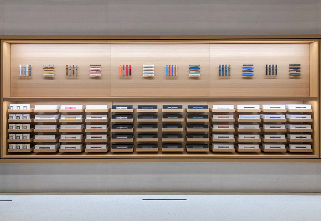 Cách bài trí bên trong của Apple Marina Bay Sands cũng giống với các cửa hàng Apple Store khác, với những chiếc bàn gỗ và kệ quen thuộc. Tuy nhiên, Apple Marina Bay Sands là Apple Store đầu tiên tại Châu Á cũng có gian hàng trưng bày các loại dây đeo Apple Watch.