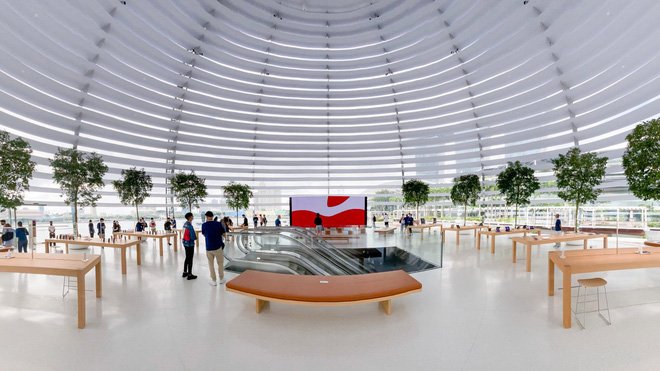 Không gian bên trong Apple Store này rất rộng. Thậm chí Apple còn trồng khá nhiều cây xanh. Du khách cũng có thể nhìn từ Apple Store ra quang cảnh khu vịnh bên ngoài tuyệt đẹp. Nó cũng có một con đường bằng gỗ từ bên ngoài vịnh đi vào, cũng là một nơi checkin tuyệt đẹp.