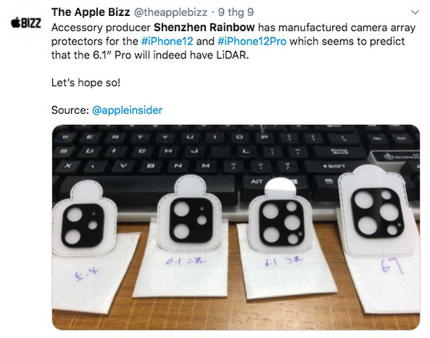 Hình ảnh đầu tiên từ nhà sản xuất phụ kiện Shenzhen Rainbow cho chúng ta thấy các tấm bảo vệ máy ảnh của toàn bộ dòng iPhone 12. Hai tấm bảo vệ ở bên trái dành cho mẫu iPhone 12 bản 5,4 inch và 6,1 inch có các đường cắt cho camera kép, đèn flash LED và micrô. Ở phía bên phải, chúng ta có thể thấy 2 tấm bảo vệ dành cho các mẫu iPhone 12 Pro và 12 Pro Max bản 6,1 inch và 6,7 inch, bao gồm các phần cắt cho 3 camera, đèn flash LED, micrô và điểm khác biệt giữa camera của 2 dòng iPhone 12 là máy quét LiDAR.