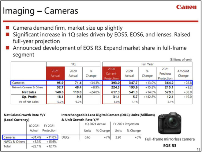 Hãng Canon cũng cho biết cả lượng máy ảnh và ống kính bán ra đều vượt quá mức kì vọng của họ trong kế hoạch. Khả năng sinh lời cũng cải thiện rõ rệt so với năm ngoái nhờ vào mức giá bán trung bình cao hơn cũng như hiệu quả bán hàng tăng vượt bậc tới mức dù vẫn có hạn chế đi lại do đại dịch, nhu cầu cho máy ảnh vẫn đứng vững.