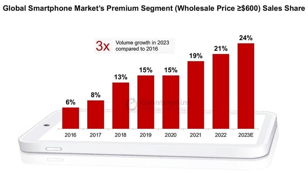 Về tổng thể, doanh số điện thoại thông minh toàn cầu được dự báo giảm 5% trong năm 2023, chạm ngưỡng thấp nhất trong 1 thập kỷ. Riêng smartphone cao cấp chiếm đến 25% doanh số bán hàng và 60% doanh thu của thị trường vào năm ngoái. Trong số này, phân khúc siêu cấp (trên 1.000 USD) chiếm 1/3 tổng doanh số điện thoại cao cấp.