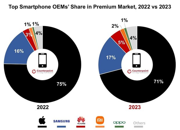 Năm 2023, thị trường điện thoại thông minh cao cấp toàn cầu bị thống trị bởi Apple. Theo Counterpoint Research , Apple chiếm đến 71% thị phần điện thoại thông minh cao cấp – vốn xét đến các mẫu smartphone có giá trên 600 USD. Mặc dù vậy, thị phần của hãng này đã giảm 4 điểm % so với năm 2022, khi họ chiếm lĩnh 75% thị phần.