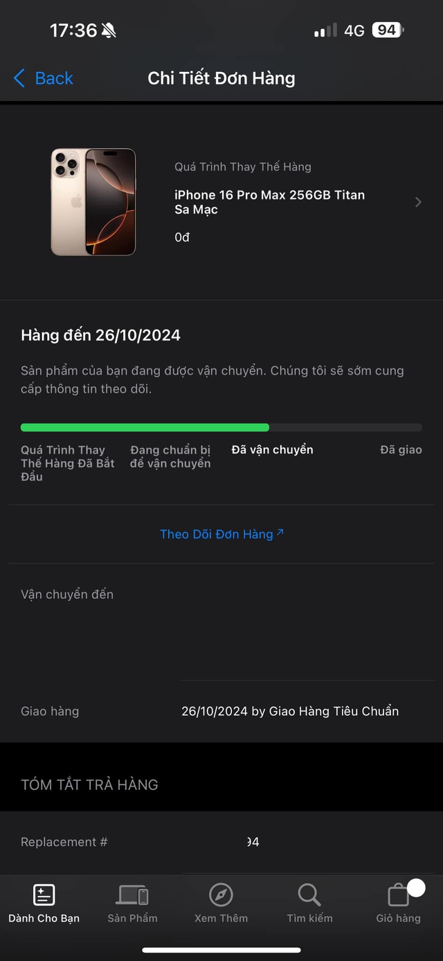 Tối 23-10, ông Hoàng Tùng (Tùng Bi, ngụ TP Hà Nội) cho biết iPhone 16 Pro Max 256GB Titan Sa Mạc - sản phẩm thay thế của Apple đã được vận chuyển. Đơn hàng này dự kiến ngày 26-10 sẽ được giao đến.