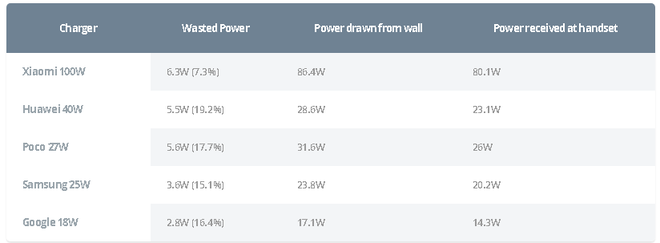 Nhưng trên thực tế, mức lãng phí điện năng của bộ sạc Xiaomi lại khá thấp, chỉ có 7,3%. Nguyên nhân là do Android Authority đã đo được nguồn điện từ tường là 86,4W và nguồn điện thực tế đi vào smartphone là 80,1W. Chúng ta có thể thấy rõ trong bảng so sánh dưới đây.