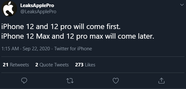 Mới đây, trên trang Twitter của mình, LeaksApplePro đã nói rằng Táo khuyết sẽ không thể phát hành cả 4 mẫu iPhone 12 cùng một lúc. Đây là trang leaker nổi tiếng, những người thường tỏ ra đúng khi nói đến các sản phẩm của Apple.