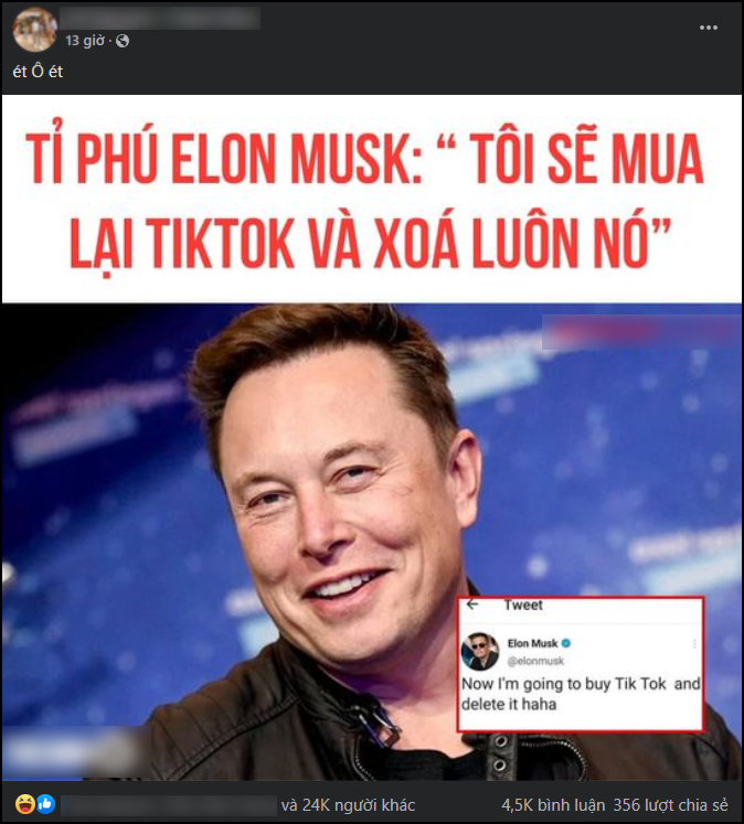 Hình ảnh này được lan truyền trên mạng xã hội và thu hút khá lớn về lượng tương tác trong mấy ngày qua. Tuy nhiên, tấm ảnh này chỉ là thông tin không đúng sự thật, bởi không có chuyện tỷ phú Elon Musk đòi mua lại và xóa TikTok. Ngoài thông tin giả này thì một số thông tin khác cũng được chế ảnh nhằm ăn theo sự kiện tỷ phú Elon Musk mua lại mạng xã hội Twitter với giá 44 tỷ USD.