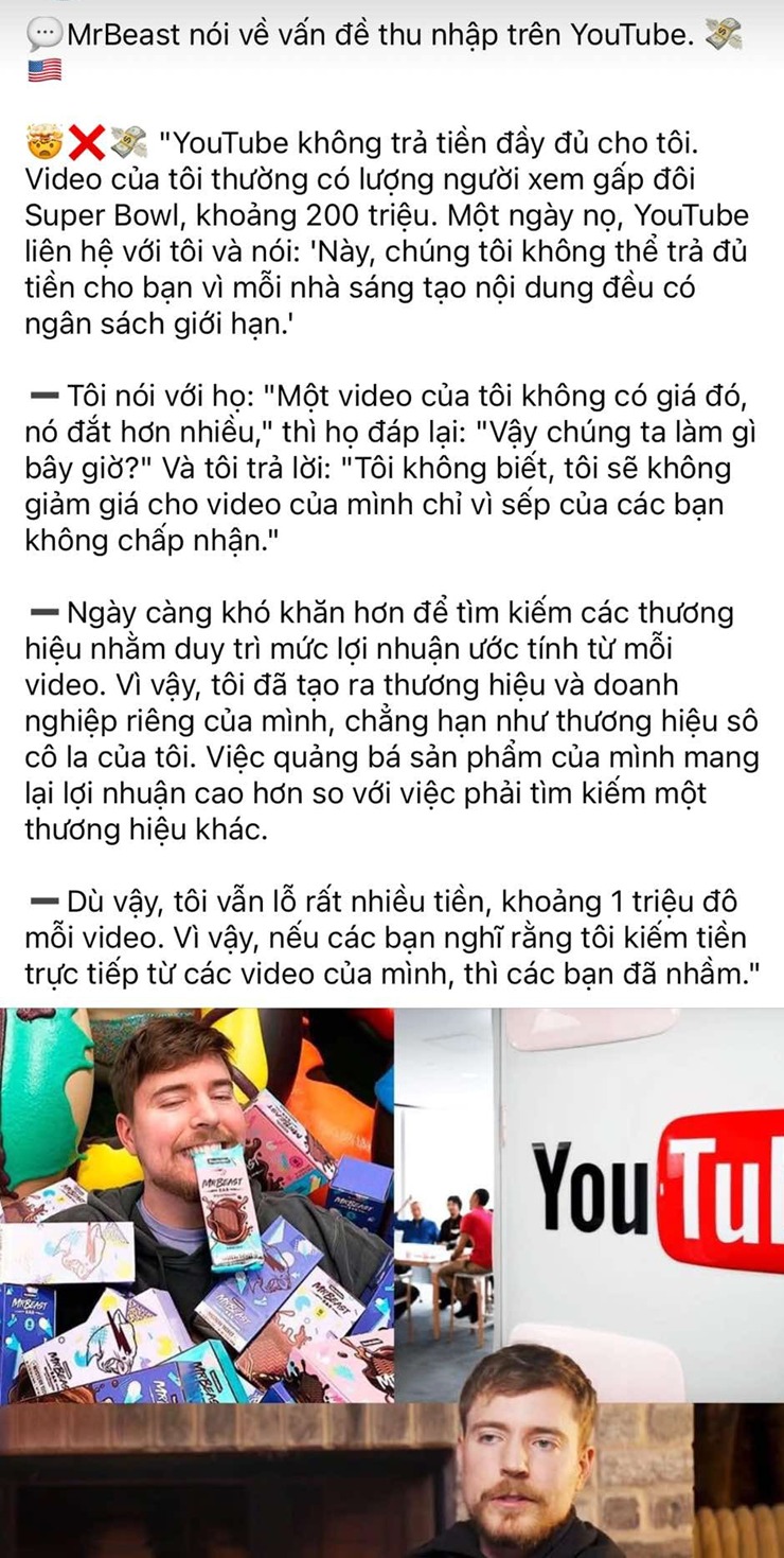 Cộng đồng mạng xôn xao trước thông tin lan truyền trên Facebook cho rằng YouTube không đủ khả năng chi trả cho MrBeast, một YouTuber nổi tiếng bậc nhất hiện nay với những video "chịu chơi" đạt hàng trăm triệu lượt xem. Thậm chí, có ý kiến cho rằng MrBeast phải tự kinh doanh để bù lỗ hàng triệu USD cho mỗi video. Sự thật đằng sau những lời đồn thổi này là gì?