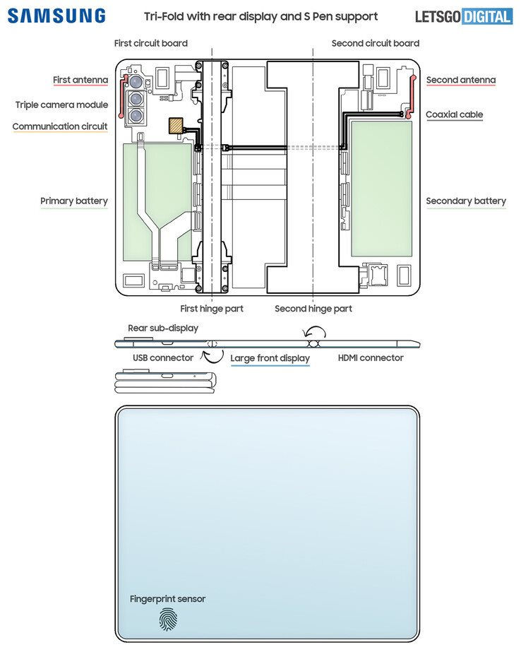 Dựa trên bản thiết kế sơ bộ và một số thông tin rò rỉ, trang LetsGoDigital đã tạo ra các bản vẽ thiết kế 3D hoàn chỉnh đầu tiên, cho chúng ta thấy chiếc smartphone màn hình gập 3 của Samsung sẽ trông như thế nào. Giống như trong bằng sáng chế của Samsung, thiết bị này sẽ có ba màn hình riêng biệt, đây cũng là màn hình chính và sẽ không có màn hình phụ bên ngoài giống như Galaxy Z Fold. Lý do là vì khi gập lại, một phần màn hình chính sẽ nằm ở phía ngoài.