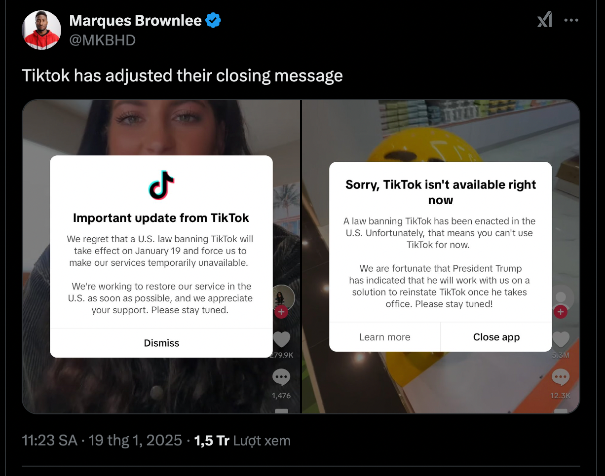Thông báo giải thích thêm: “Một đạo luật cấm TikTok đã được ban hành tại Mỹ. Điều này đồng nghĩa với việc bạn không thể sử dụng TikTok trong thời gian tới. Chúng tôi rất vui khi Tổng thống Trump đã bày tỏ ý định hợp tác cùng chúng tôi để tìm giải pháp khôi phục TikTok khi ông nhậm chức. Xin vui lòng chờ đón thông tin mới nhất!”.