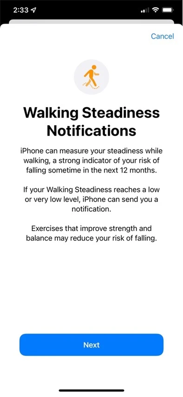 Ngoài ra, ứng dụng Sức khỏe còn gửi cả thông báo Đi lại ổn định (Walking Steadiness) khi chỉ số xuống thấp, vì người dùng có nguy cơ té ngã cao và nên tập luyện để nâng cao sức khỏe, tạo sự cân bằng. Ứng dụng cung cấp video 5 bài tập để làm theo. Chỉ số được tính toán dựa trên tốc độ đi bộ, đi bộ bất đối xứng, độ dài bước chân và chu kỳ của bước đi.