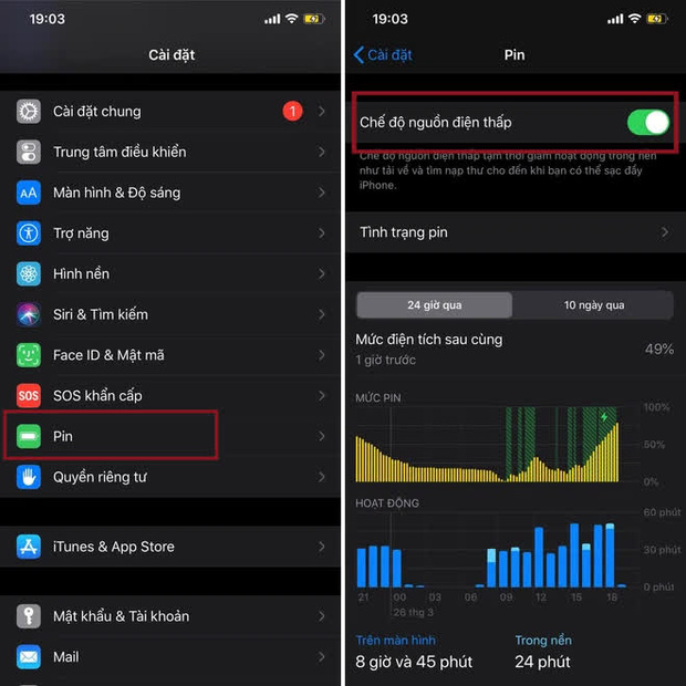 Vào Cài đặt chọn Pin => bật Chế độ nguồn điện thấp.